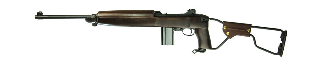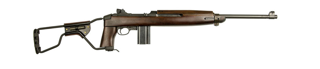 The M1A1 carbine is modeled after a late production 1944 M1A1 Paratrooper model with a folding "low wood" walnut stock, type two barrel band, and includes the same adjustable sights which were actually introduced in 1944.